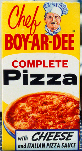 What was an 8 year olds saving grace? Once a week my Dad would make pizza. Now that was an altogether different deal. He would break out the box of Chef Boy-Ar-Dee. It contained all you needed to make a fine family pizza dinner. The mix for dough (Just add water!), a can of tomato sauce and that ubiquitous green can of Kraft parmesan cheese. All pulled off the shelf, not from the fridge. Just how I liked it. I loved that night. I never asked “Whats for dinner?” Dad never answered “Shit on a shingle”. Because when it was pizza night he actually knew what was for dinner because he was making it. The ingredients were conveniently listed on the back of the box. That was the best pizza I ever ate and to this day I can remember the smell wafting to my bedroom. No oniony, garlicky, gingery weirdness. Just tomato sauce and bread.